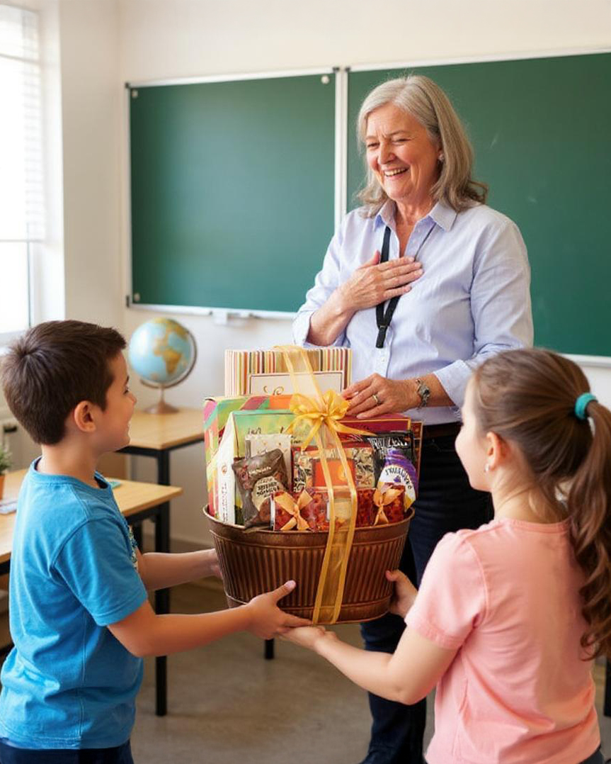 What could be easier for her than to just reach over and grab some candies, chocolates or dried fruits when she gets the nibbles? Plus, gift baskets are great choices if you can’t be there in person.