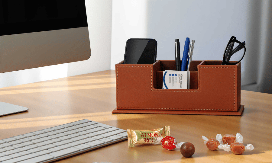 For example, a leather desk organiser gift set that arrives filled with tasty treats but can later be reused as a durable, multi-section pencil pot or note holder offers both style and practicality, reducing waste and keeping your brand in sight each day.