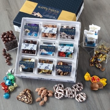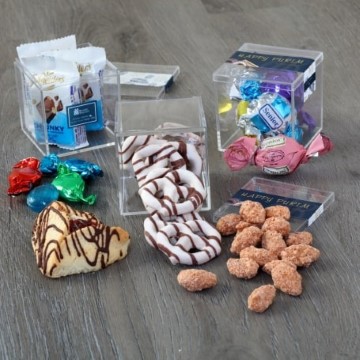 Ensconced in our very own designer gift box is a set of 9 lucite cubes overstuffed with cinnamon yogurt graham pretzels, premium chocolate truffles,, cinnamon toasted almonds and much more!
