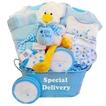 Look what the stork has brought! This adorable gift basket is filled with super sweet items to welcome the new arrival. A satin lined baby blanket, Keepsake handprint tin, and plush stork will brighten the day of the new parents and help convey your warmest wishes for their growing family.