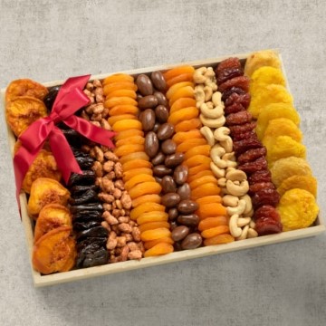 Our dried fruit & nuts gift tray is artistically arranged in an eye-pleasing display to make that perfect statement. With succulent peaches, handfuls of apricots, along with a tasteful collection of pears, plums, and prunes. Add our mixture of salty, sweet, and dark chocolate covered nuts. This dried fruit gift tray is sure to please.