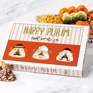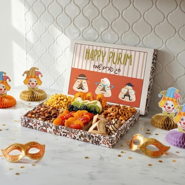 This gourmet Purim gift tray will truly enhance any Purim table. With a dried fruit selection of luscious dried fruits and nuts including, dried peaches, apricots, apples, a trio of fruit-filled hamantashen, sweet and savory snack mix, roasted corn nuggets, and very berry trail mix! A truly spiritual experience