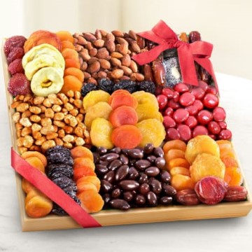 This stunning arrangement includes a delicious mix of dried fruits, nuts, and chocolates in a beautifully crafted wooden gift tray. With a tasty assortment of Dried Mediterranean Apricots, Dried Pears, Roasted Salted Almonds, Chocolate Covered Cherries, and many more mouthwatering foods, this gift tray is the ultimate assortment of dried fruits, nuts, and chocolates.