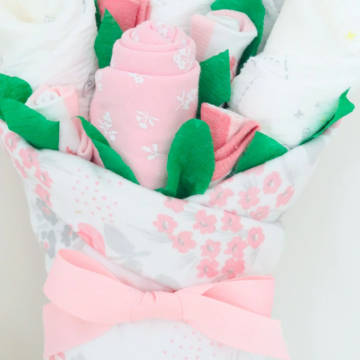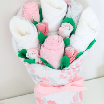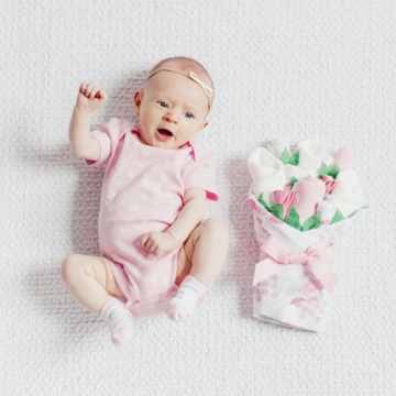 If you're searching for a thoughtful and unique gift for a new baby girl, our Baby Blossom layette bouquet is the perfect choice! Each item in the bouquet is carefully designed by us and features charming and exclusive prints that you won't find anywhere else. This special gift is sure to delight both the new parents and their precious little one.