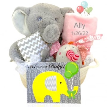 This adorable gift basket has everything that parents need for a sweet and soothing lullaby. This cotton rope gift basket contains a Plush Security Blanket (can be customized), Plush Elephant, Elephant Rattle, Oversized Cotton Burp Cloth, along with Ribbons and Cello for gift giving.