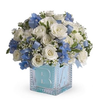 He'll be building block towers soon enough! For now, celebrate him with this beautiful keepsake baby block. Filled with soft blues and whites, the glass block can be used later in baby's room and makes a memorable baby boy gift.