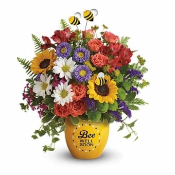 Wish them well with this bright, beautiful bouquet! From orange roses and red alstroemeria, to lavender asters and mini sunflowers, this rainbow of blooms will brighten their space - and their spirits. It's hand-delivered in a charming "Bee Well Soon" pot with darling bee decorations.