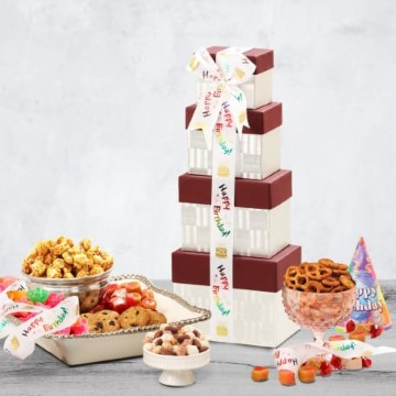 When you want the biggest and best birthday gift baskets and gift towers, Broadway Basketeers has the selection you need! Indulge the birthday boy or birthday girl with an incredible gourmet collection of sweet and savory snacks. Great for men and women of all ages too! This gorgeous gift set features a stunning stack of gift boxes filled with delicious treats. Try one for your daughter, son, mother, or father today and send the best birthday wishes!