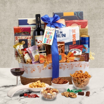 Make their birthday extra special with a deluxe bottle wine and a grand gift basket. Each premium gift basket is filled to the brim with gourmet popcorn, sweet and savory snacks, and freshly baked cookies to pair with a crisp bottle of wine.