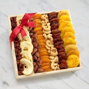 Our dried fruit & nut gift tray artistically arranged in an eye-pleasing way to make that perfect statement. Whether birthday, get well, or as a corporate gift, this tray is bound to impress your recipient. With dried plums, pears and a mixture of nuts, our dried fruit gift tray is sure to please.