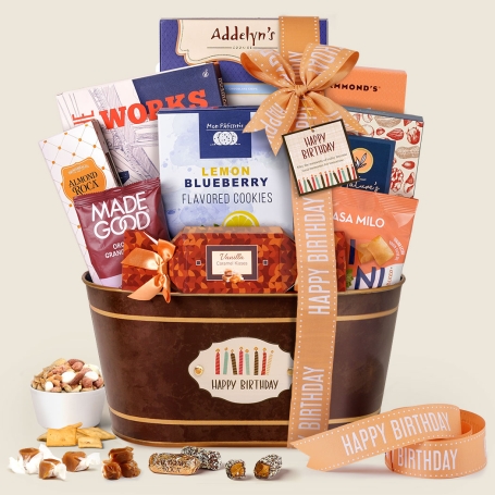 This beautiful Birthday Snacks Gift Basket is the perfect way to share your birthday wishes with family, friends, and business associates. This elegant birthday gift basket is brimming with a delicious assortment of snacks, gourmet treats, tasty nuts, and many more exciting delights.
