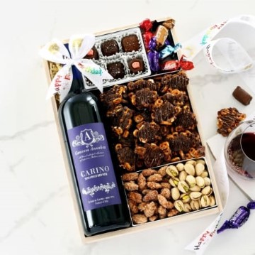 This beautiful birthday gift tray will make a big impression on their special day of the year. Make this birthday the best yet with an amply filled tray, brimming with sweet and savory treats with a special addition of Carino Semi-sweet red wine. This birthday gift is perfect for men and women. Indulge them this year with our selection of creamy gourmet chocolates, truffles, and candied nuts, which pair perfectly with the sweet notes of this fruity red wine.