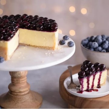 Plump, whole blueberries drenched in a rich syrup top our original cheesecake. Lots of sweet berries in every bite.