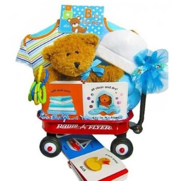 A baby boy is born! This cute Radio Flyer wagon features essentials for the newborn that mom will love. Every newborn needs a teddy and a bedtime story. Included is a wonderful board book where baby can touch and feel different textures.