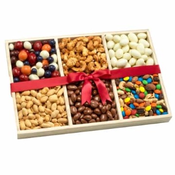 This lovely gift tray arrangement includes: assorted milk toffee, gourmet jelly bellies, salted and roasted peanuts, Mijou toffee cashews, health mix, french burnt peanuts