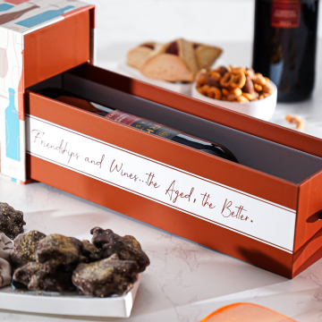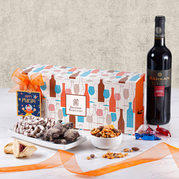 Indulge in a unique Puirm wine gift with our custom Buried Treasures Shalach Manot gift set that include a bottle of dry red wine, snacks and sweets