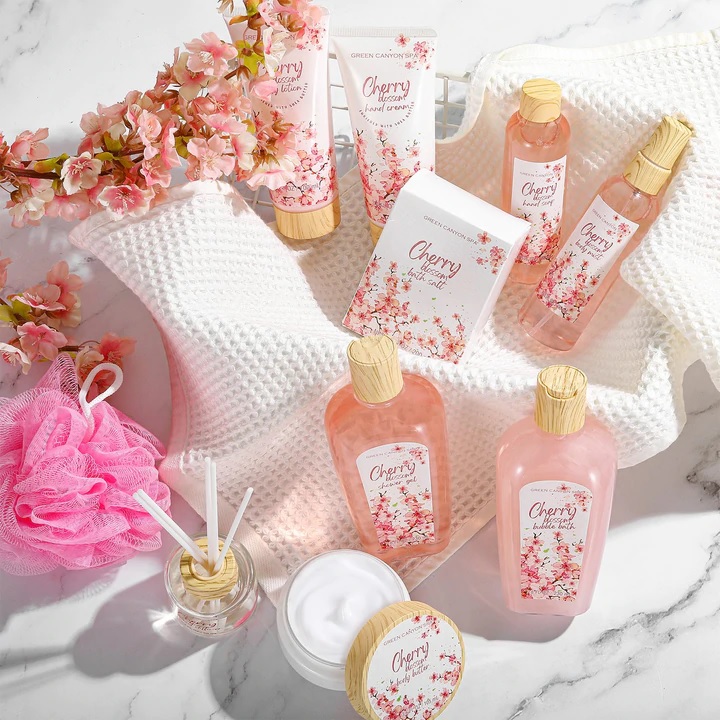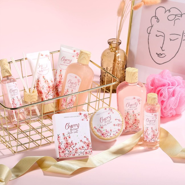 A delightful spa basket with a cherry scent. Includes creams, gels, bath bombs, and more!