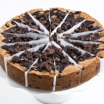 This giant Deep Dish Cookie is filled with chocolate chips and topped with huge chunks of chocolate, Hershey's Mini Kisses, and drizzled with chocolate ganache. At 10 inches in diameter, it weighs in at four pounds and can serve up to 14 people! It's the perfect cookie cake for your next gathering!
