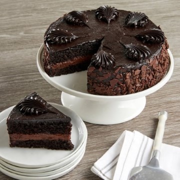 Two rich, chocolate cake layers are filled with luscious chocolate whipped cream mousse, then covered with milk chocolate frosting and a dark chocolate glaze. This best selling delight is then garnished with fudge rosettes and dark chocolate shaves.