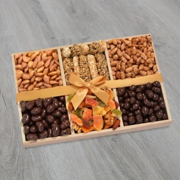 Enjoy this deluxe gift tray with family & friends. This six sectional wooden tray comes with Mounds of Chocolate covered peanuts, perfectly roasted and salted jumbo cashews, roasted & salted almonds, succulent fruit & nut medley, cashews dunked in dark chocolate and a collection of Viennese crunch in dark & white flavors. The perfect gift for any occasion.