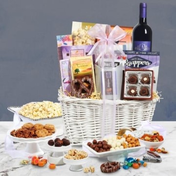 When you want to treat your gift recipient to something extra special, this classic white wicker gourmet gift basket has everything you need! Savory snacks, sweet treats, and semi-sweet red wine with notes of ripe sweet fruit that finishes with a rich chocolate for those 21+. Indulge yourself or your special loved one with a selection of goodies that never fail to please no matter the holiday event. Perfect for the Christmas season corporate clients that deserve a flavorful treat!