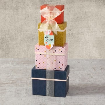 Treat your recipient to a colorful gift tower that is filled with scrumptious Easter goodies. This beautiful gift tower is brimming with Premium Chocolate, Gourmet Caramel Popcorn, Cookies, Assorted Milk Toffees, and many more gourmet treats.