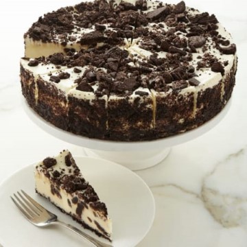 Two all time favorites in one cheesecake. Chocolate wafer discs with cream topping covered with white chocolate drizzle. The middle of the cheesecake is filled with more chocolate cookies. It's what dreams are made of!