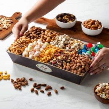 Discover our Deluxe 10-in-1 Nuts, Trail Mix, and Sweets Gift Tray. Indulge in roasted pistachios, salted almonds, toasted corn nuggets, and cinnamon peanuts. Explorre with berry cherry trail mix, creme brulee trail mix, sweet and savory snack mix & butter toffee mixed nuts. Elevate your snacking now.