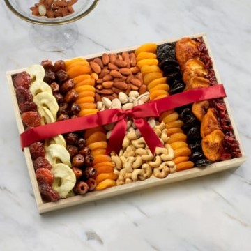 This gourmet dried fruit & nut gift tray is filled with a large assortment of luscious dried fruits and nuts including, dried plums, peaches, dates, apples, roasted and salted cashews, roasted and salted almonds and more! A great corporate and healthy gift.