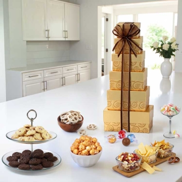 This gift tower is an impressive showstopper of a gift tower. Standing approximately one and a half feet tall, this gift set of 6 deluxe gift boxes open to reveal an impressive array of the finest gourmet treats. Excellent for holidays, anniversaries, and every occasion - Broadway Basketeers has the gifts you love!