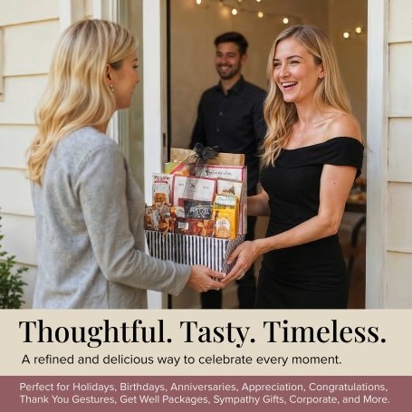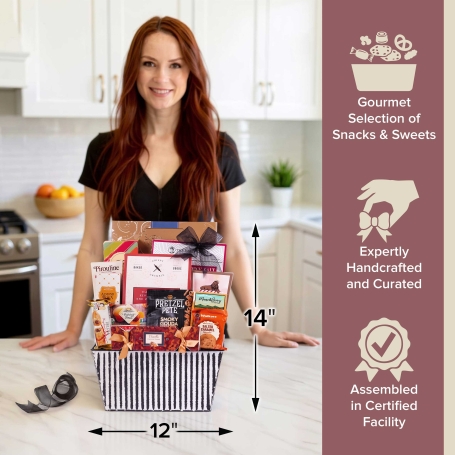 This Sweet and Savory Gourmet Gift Basket comes Filled with Luscious treats and sweets and much, much more! When you need to make that perfect impression, depend on the Deluxe Striped Gift Basket to WOW! your recipient.