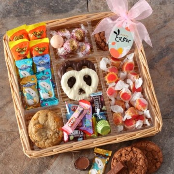 This delightful gift tray is the perfect Easter gift for any sweet tooth. This beautifully weaved gift tray is filled with Ghirardelli Chocolate Bunnies, Reese’s Chocolate Peanut Butter Easter Eggs, Mint Chocolate Chip Cookies, Lindt Chocolate Truffles, and many more Easter-themed treats.