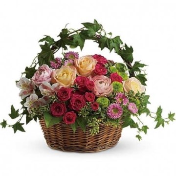 A fairy tale…in flowers! Delicate ivy climbs the handle of this round wicker basket that's home to a feminine garden of fuchsia flowers. You can almost imagine garden sprites dancing through the country style arrangement!