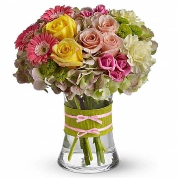 Mini pink gerberas, lush green hydrangea, yellow and pink roses, yellow carnations and green button mums are arranged in a clear concave vase that's trimmed with a chartreuse taffeta ribbon and pink raffia.