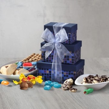 These decorative designer boxes will truly delight your recipients! A mishloach manos bound to dazzle their taste buds with an array of upscale chocolate and flavored sweets, chocolate-filled wafer rolls, a duo of fruit-filled hamantaschen alongside drizzled rice bites. A delightful way to send your sweet Purim Mishloach Manot wishes