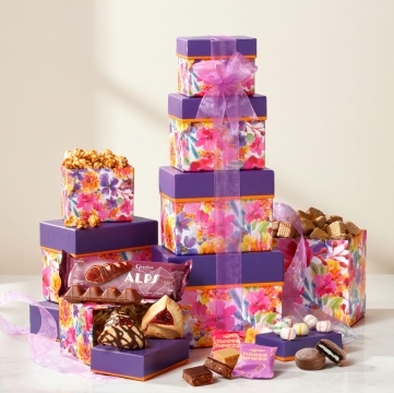 Celebrate Purim with the Floral Delight Purim Gift Tower, a beautifully stacked collection of festive favorites presented in vibrant floral gift boxes. Inside, they’ll enjoy gourmet caramel popcorn, rich chocolate peanut butter bites, a Geneve chocolate truffle bar, fruit-filled and chocolate-drizzled hamantash, chocolate wafer cubes, and more.