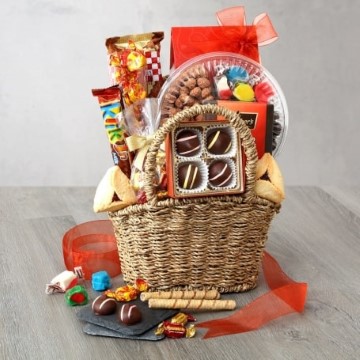 A decorative gift basket overstuffed with enjoyable and tasty Purim treats. This Purim selection Includes premium chocolate truffles, seasoned pita chips, salt water taffies, cinnamon peanuts, chocolate covered peanuts and much more!
