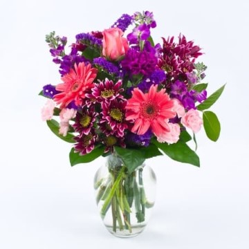 Intended to capture their every attention, the Garden Beauty Bouquet pops with color and a soft fragrance to send your sweetest wishes to your special recipient! Picked fresh from the farm, this bouquet exhibits the winning color combination of pink and purple bringing together hot pink gerbera daisies, pink roses, purple gilly flower, purple chrysanthemums, purple mini carnations, pink mini carnations purple statice, and lush greens to create an exceptional gift. Presented with a classic clear glass vase, this fresh bouquet is set to make that perfect impression when sent to celebrate a birthday, or express your get well, or thank you sentiments.