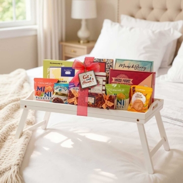 Cheer up your recipient with a unique Get Well Breakfast Tray from Broadway Basketeers. This premium wooden breakfast tray is perfect for enjoying breakfast in bed and includes a delicious assortment of gourmet treats that will surely brighten their day.