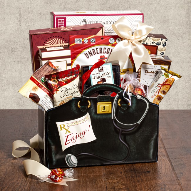 Wish your recipient well with a thoughtful and unique gift basket that is brimming with delicious gourmet sweets and treats. This unique gift box is shaped like a doctor’s bag and contains delicious treats that are sure to brighten your recipients day. This gift basket includes Lindt Chocolate Truffles, Chocolate Amaretto Almonds, Seasoned Pretzel Twists, and many more scrumptious sweet and savory snacks.