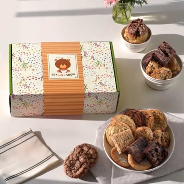 Send warm get well wishes with a thoughtful gift box filled with comforting gourmet treats. This get well gift includes freshly baked cookies, rich brownies, fluffy muffins, and other delicious snacks to lift their spirits. A perfect care package to let friends, family, or colleagues know you’re thinking of them and wishing them a speedy recovery.