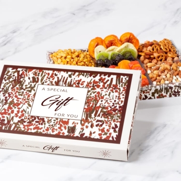 This Mothers Day arrangement includes an assortment of nut mixes alongside dried apricots, prunes, peaches, plumbs and more. Gift tray is hand crafted and delightfully arranged. Stuffed with the most delicious and freshest dried fruits and nuts from the sun-bathed California valley