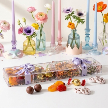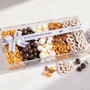 Celebrate Purim with a modern twist on tradition. The Gourmet Sectional Purim Gift Tray features a reusable floral lucite tray with lid, beautifully filled with Belgian chocolate truffles, vanilla coated pretzels, sweet and savory snack mix, and premium dried apricots and plums.