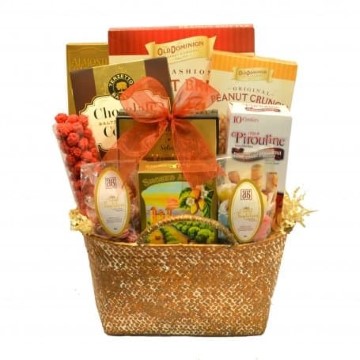 This is a classic gift basket gift for any occasion. Our Savory Sweets Gift Basket is filled with peanut brittle & crunch, dried fruit, smoked almonds, french roasted peanuts, chocolate salted caramel cookies and more! A gift basket filled with sweets and savory snacks that all will love!
