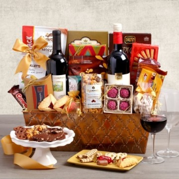 When a simple gift won’t do, make your entrance with this elaborate Gift basket. This gift basket includes two selections of fine wines. Herzog Lineage and a Weinstock Cabernet dry red wine. An appreciated and thoughtful wine gift basket.