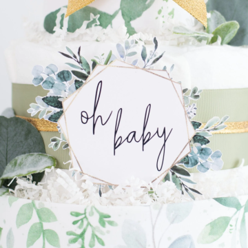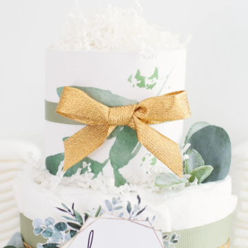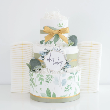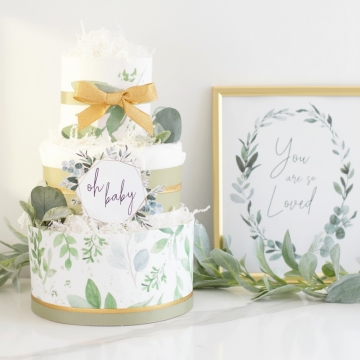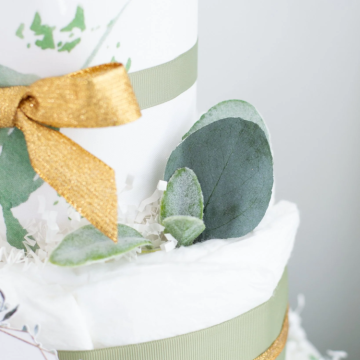 Our greenery diaper cake makes the perfect decoration for a gender neutral baby shower. The mom-to-be and other shower guests will be swooning over the gorgeous custom printed fabric and details. The mom will also love that this cake is also filled with diapers she can use once her baby arrives!