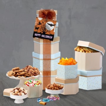 This festive Halloween gift features a gift tower is brimming with delicious goodies. Each box is filled to the brim with gourmet treats such as Butter Toffee Mixed Nuts, Chocolate Chip Cookies, Assorted Butter Toffees, and many more tasty treats.