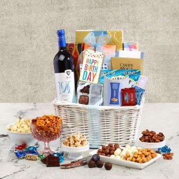 Celebrate their birthday with this delightful wine basket. Filled with chocolate, snacks, treats, and of course wine!
