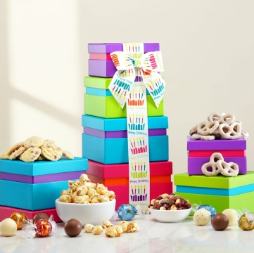 Want to send your sweet some sweets on their birthday? Get that special someone who also has a raging sweet tooth our Happy Birthday Wishes Gift Tower. With an assortment of snacks, they’ll eagerly tear into, our tower offers the perfect way to celebrate a birthday. In fact, the tasty and delicious snacks may not last long, though the boxes they come in, will. They can be reused for decorations around your home or office.