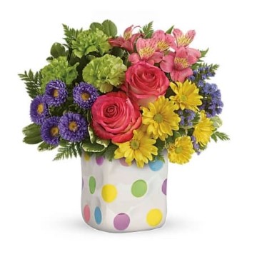 Let's get happy! Cheerful, hand-painted dots dance joyfully beneath a bright, beautiful mix of roses, alstroemeria, carnations and asters. With its organic, hand-thrown shape and playful color scheme, this springtime favorite will be a go-to décor piece for any happy occasion!